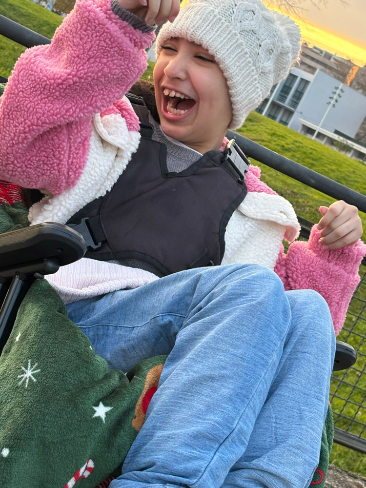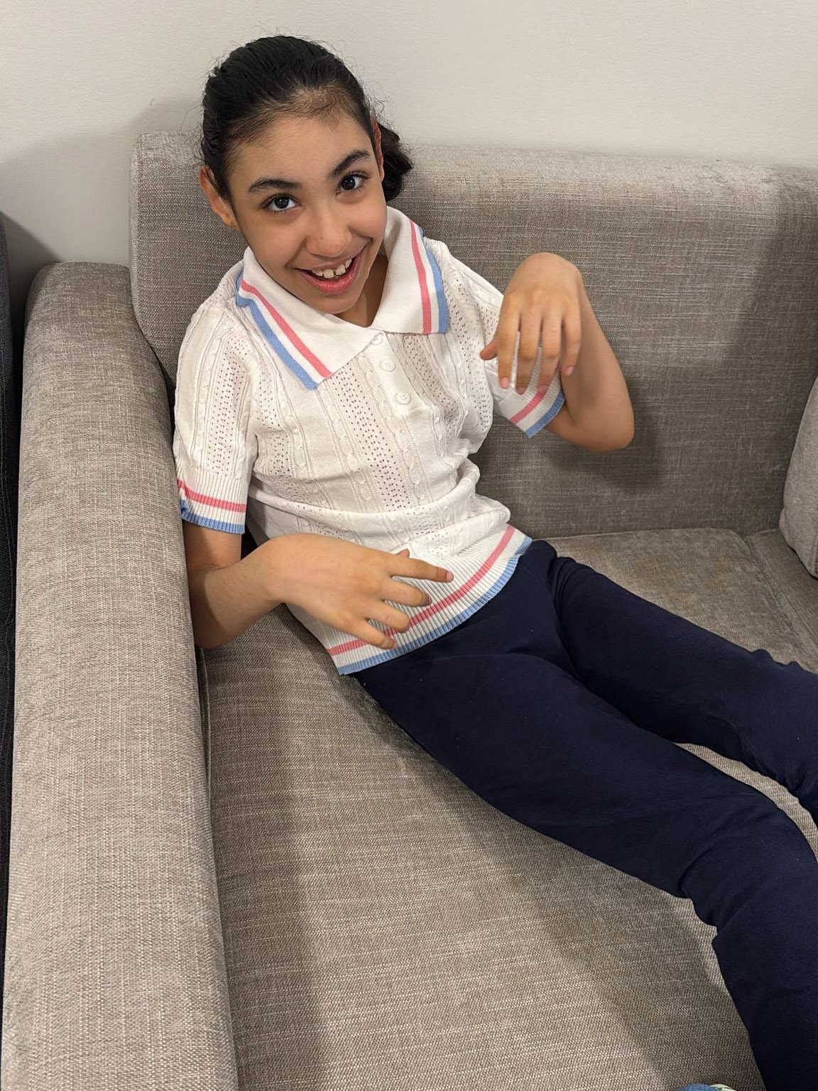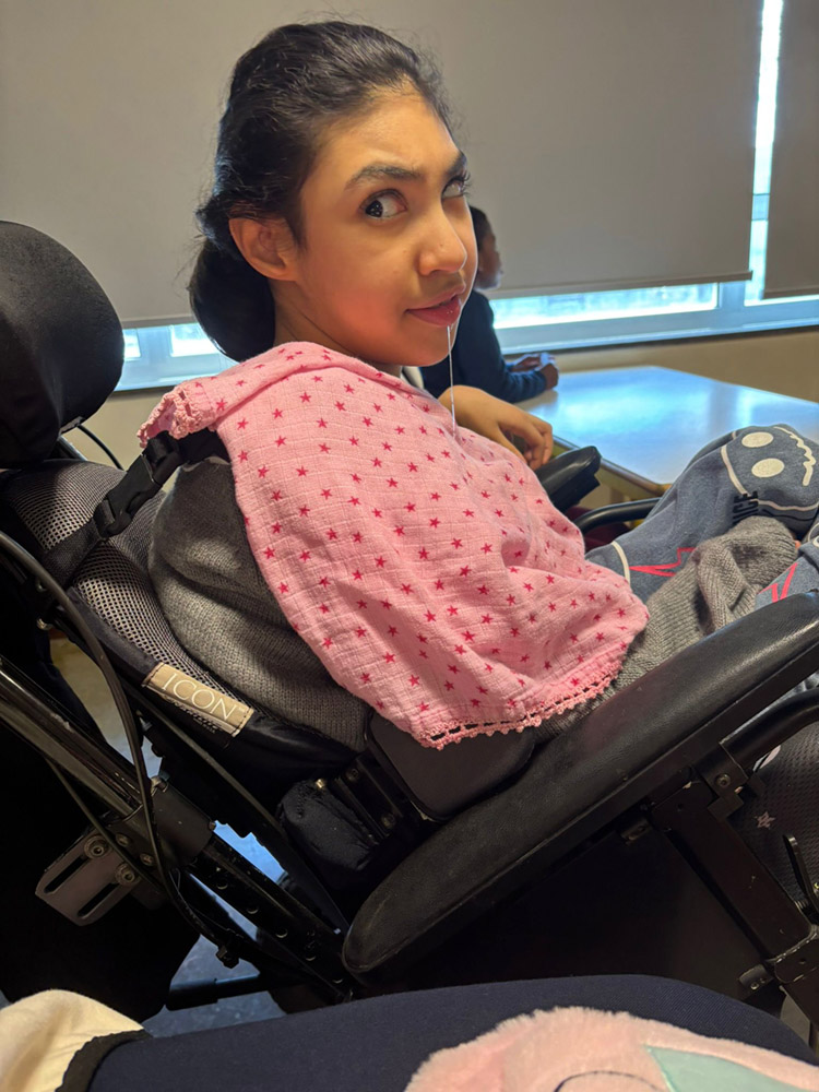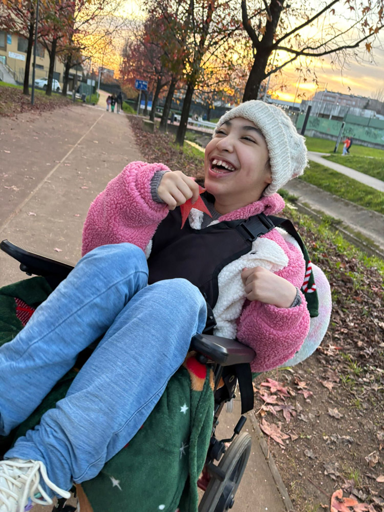 Devido às complicações neurológicas associadas, a nossa menina apresenta limitações motoras e cognitivas importantes: não andar, não senta sem apoio e não fala. A sua alimentação é restrita a preparações pastosas e passadas, para facilitar a deglutição e reduzir o risco de engasgos.